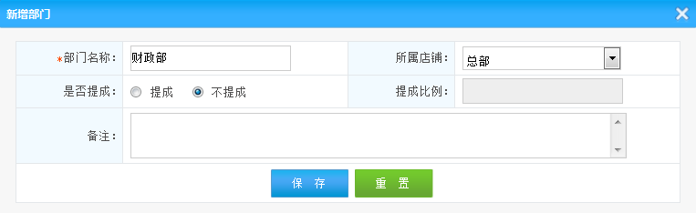 查看員工部門列表: 1.新增部門:添加新的部門 (見下圖) 2.查詢:可以根據(jù)店鋪的名稱 查詢該店鋪內的一些部門(默認查詢的是當前店鋪的子部門) 3.部門列表:在列表中的操作一欄 可以對該部門進行編輯或者是刪除