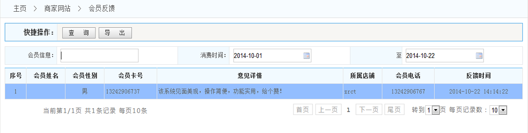 2.導出:可以將按條件查詢出來的會員反饋列表 以Excel形式導出