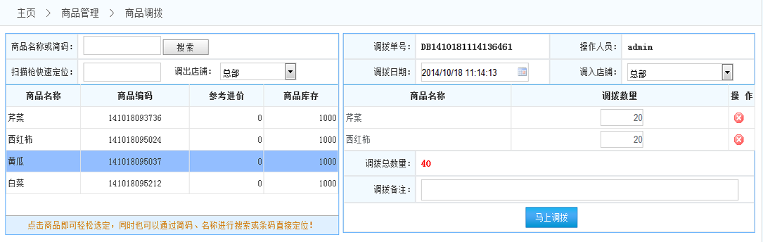 2.選擇商品:在商品列表中 雙擊需要調(diào)撥的禮品,系統(tǒng)會自動將其加入調(diào)撥列表中