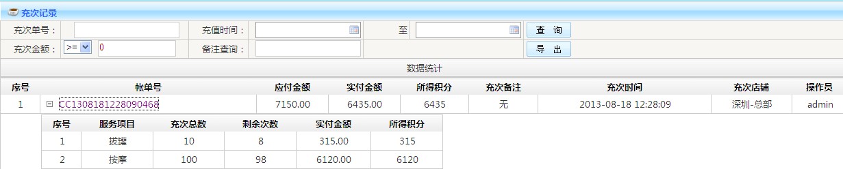 充次記錄:查詢(xún)會(huì)員自己的充次記錄并可以導(dǎo)出Excel文檔
